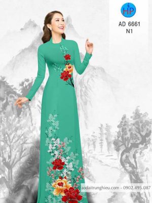 Vải áo dài hoa Mẫu đơn xanh thiết kế 2019 AD 6338